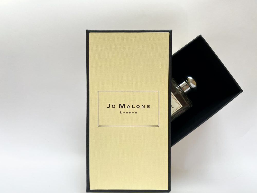 The ribbon knot has to be removed before opening the box. Inside the box lies a transparent bottle almost filled to the brim with a clear fragrance. The classic bottle is narrow and has rounded edges. On top of the bottle, there’s a sticker that carries the Jo Malone brand. Be aware of Jo Malone Orange Blossom dupe that comes in almost similar packaging.